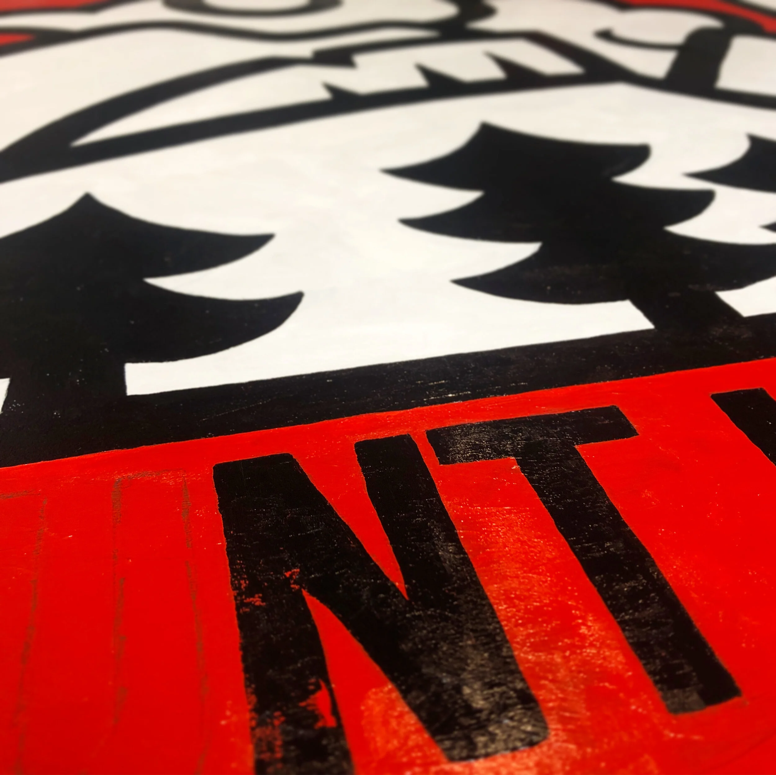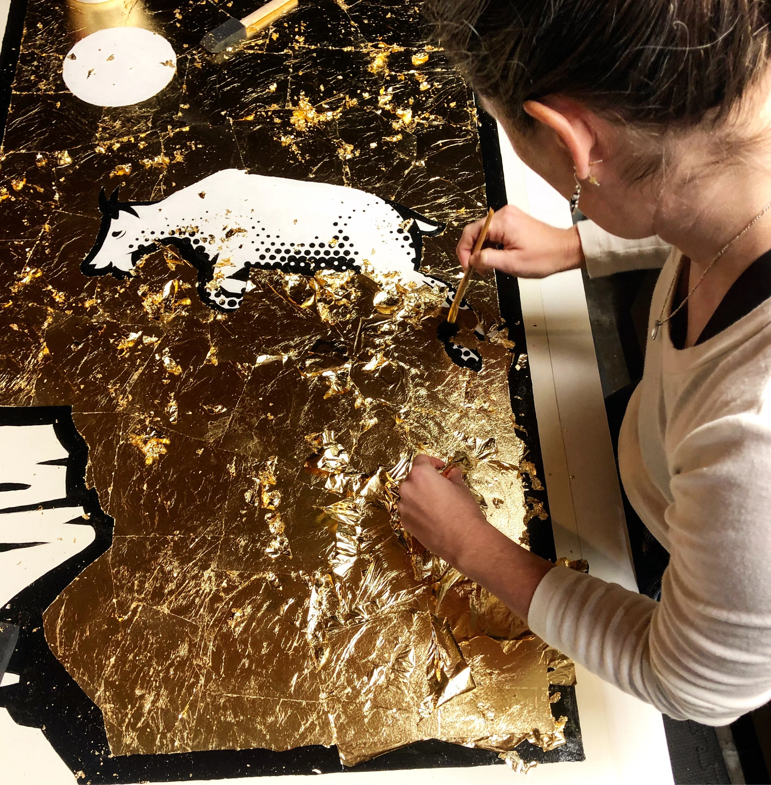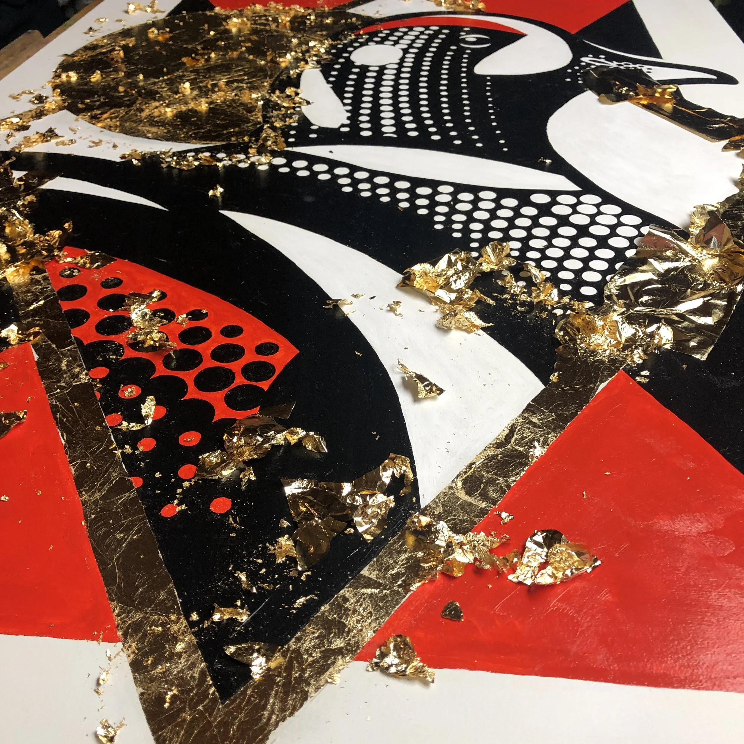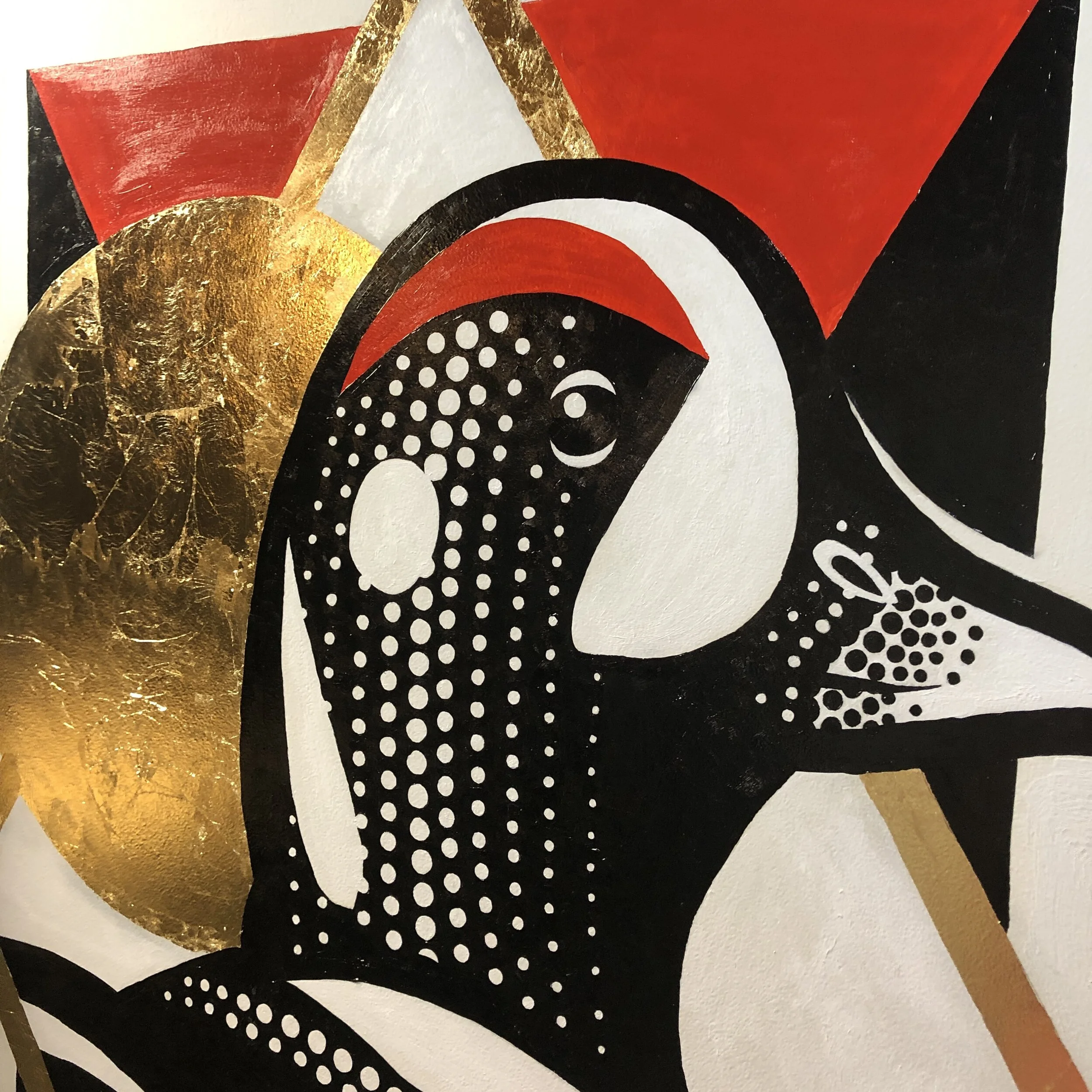 The paintings are decorative, bright and unique, with the same exaggerated halftone style, limited color palette, and modern western subject matter as my prints. 24”x36”.
